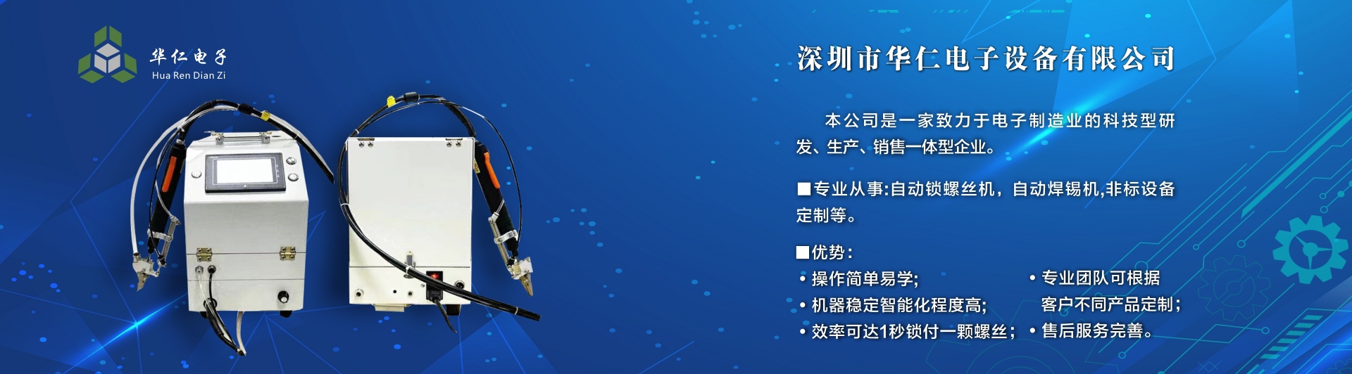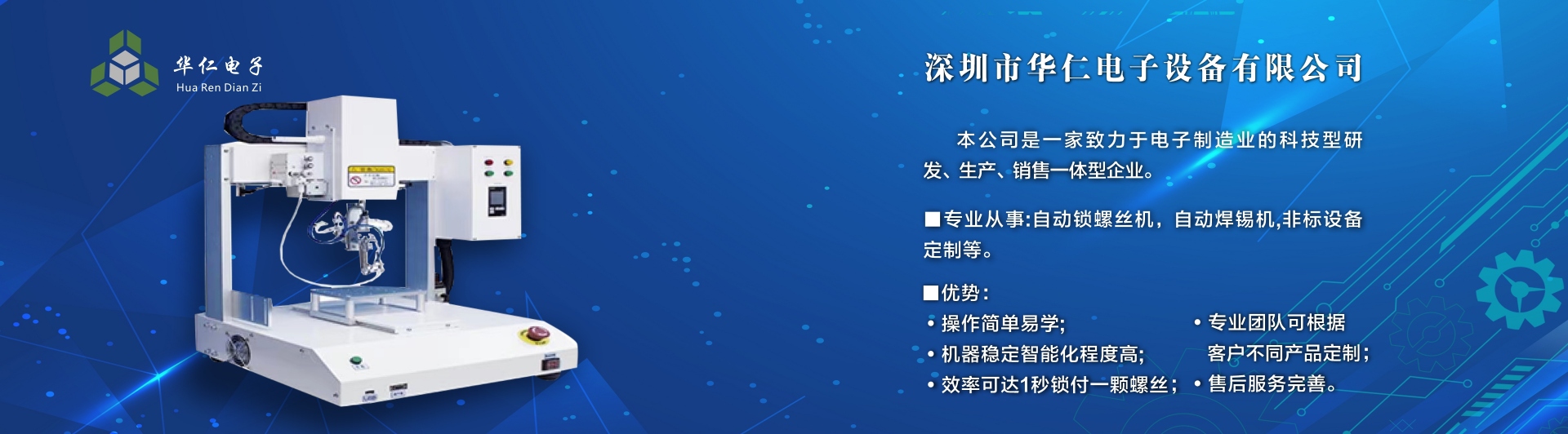深圳市華仁電子設(shè)備有限公司是一家致力于電子制造業(yè)周邊設(shè)備的科技型研發(fā)、生產(chǎn)、銷售一體的企業(yè),專業(yè)從事:自動(dòng)鎖螺絲機(jī);自動(dòng)焊錫機(jī);非標(biāo)設(shè)備定制機(jī)等,公司長(zhǎng)期以來在行業(yè)中積累了豐富的經(jīng)驗(yàn),擁有專業(yè)的研發(fā)、技術(shù)、銷售支持工程團(tuán)隊(duì)、各高級(jí)技術(shù)人才為客戶提供優(yōu)質(zhì)產(chǎn)品和服務(wù),同時(shí)不斷吸取國內(nèi)外先進(jìn)技術(shù),更準(zhǔn)確及時(shí)地為客戶提供優(yōu)質(zhì),性價(jià)比高的產(chǎn)品、公司以專業(yè)的售前、售中、售后服務(wù)贏得了客戶的信賴和好評(píng),為客戶提供先進(jìn)自動(dòng)化設(shè)備一體式解決方案、